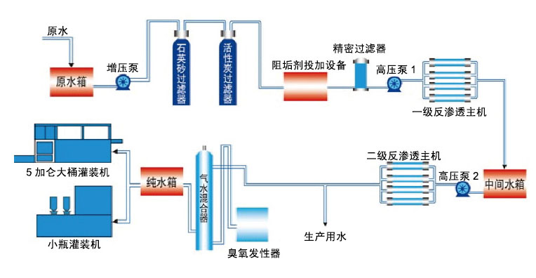 除了產(chǎn)品本身,飲料生產(chǎn)線還需用到工藝水,如清洗水和冷卻水。無論瓶裝水、飲料產(chǎn)品水或工藝水,均是原水經(jīng)過處理后獲得。典型的水處理系統(tǒng)包括預(yù)處理(砂濾、炭濾、精濾)、膜分離(反滲透/超濾/納濾)、消毒滅菌(臭氧或紫外線)三個部分。您提供水源,我們總能找到最佳的凈化處理方案。
